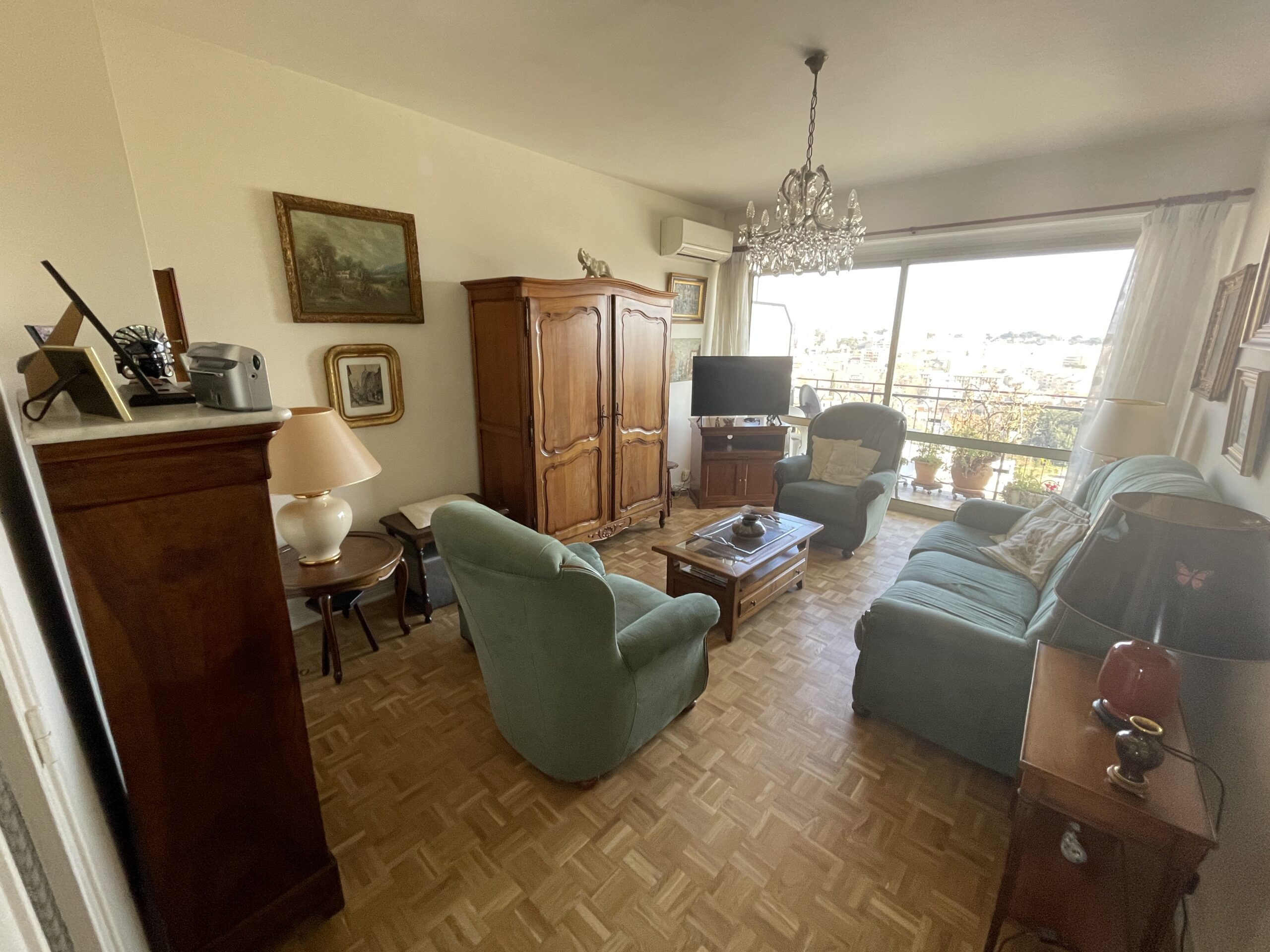 Appartement en bon état, avec climatiseurs, double vitrage stores électriques, parquet. Comprenant un hall avec grand placard, une véranda, un séjour sur balcon, une cuisine équipée, une salle d ‘eau, une chambre, une cave et une place de parking privatif en sous-sol.